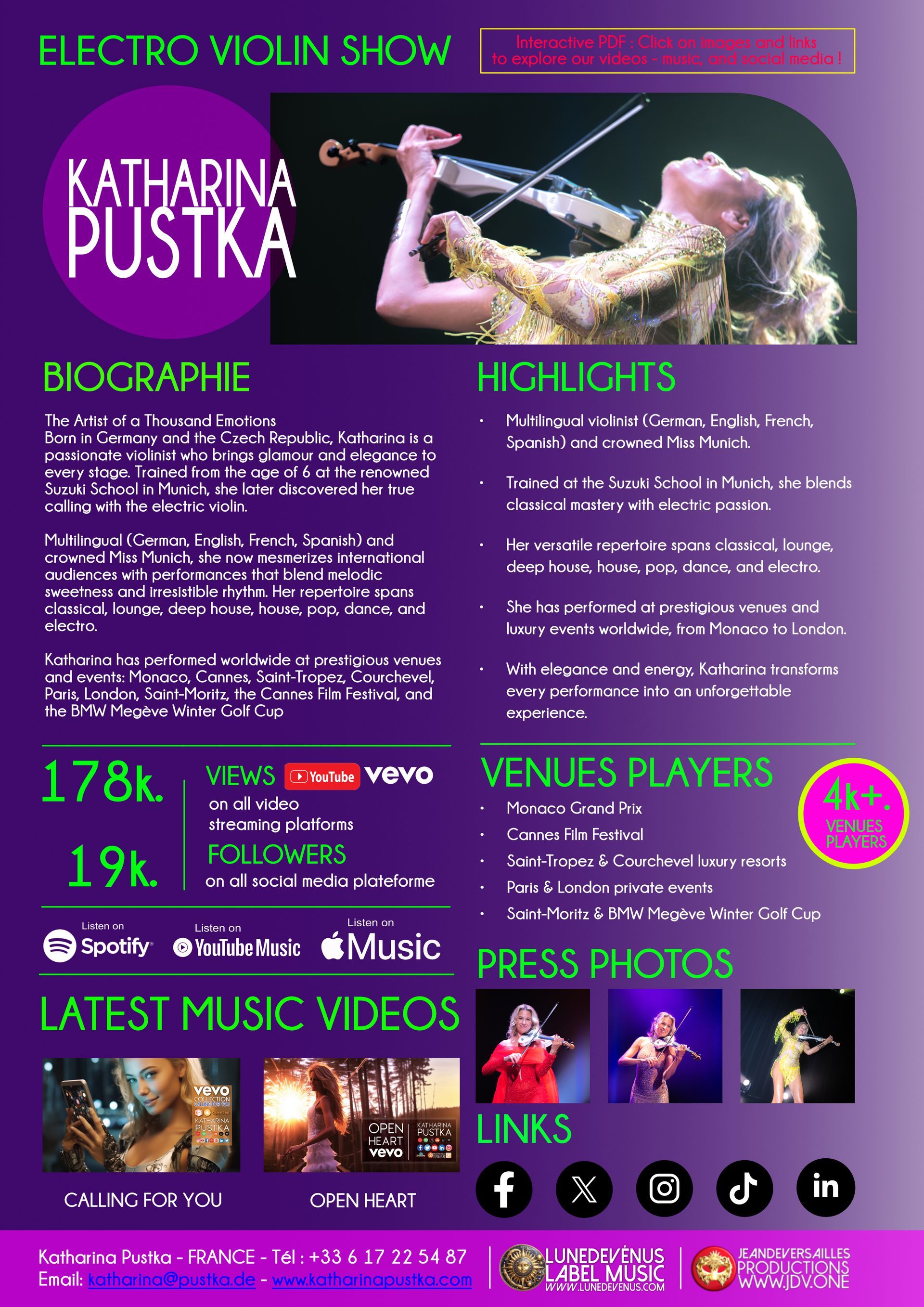 - Professional newsletters and interactive press kits (PDFs with photos, videos, streaming links: Spotify, Apple Music, Amazon Music, etc.)
