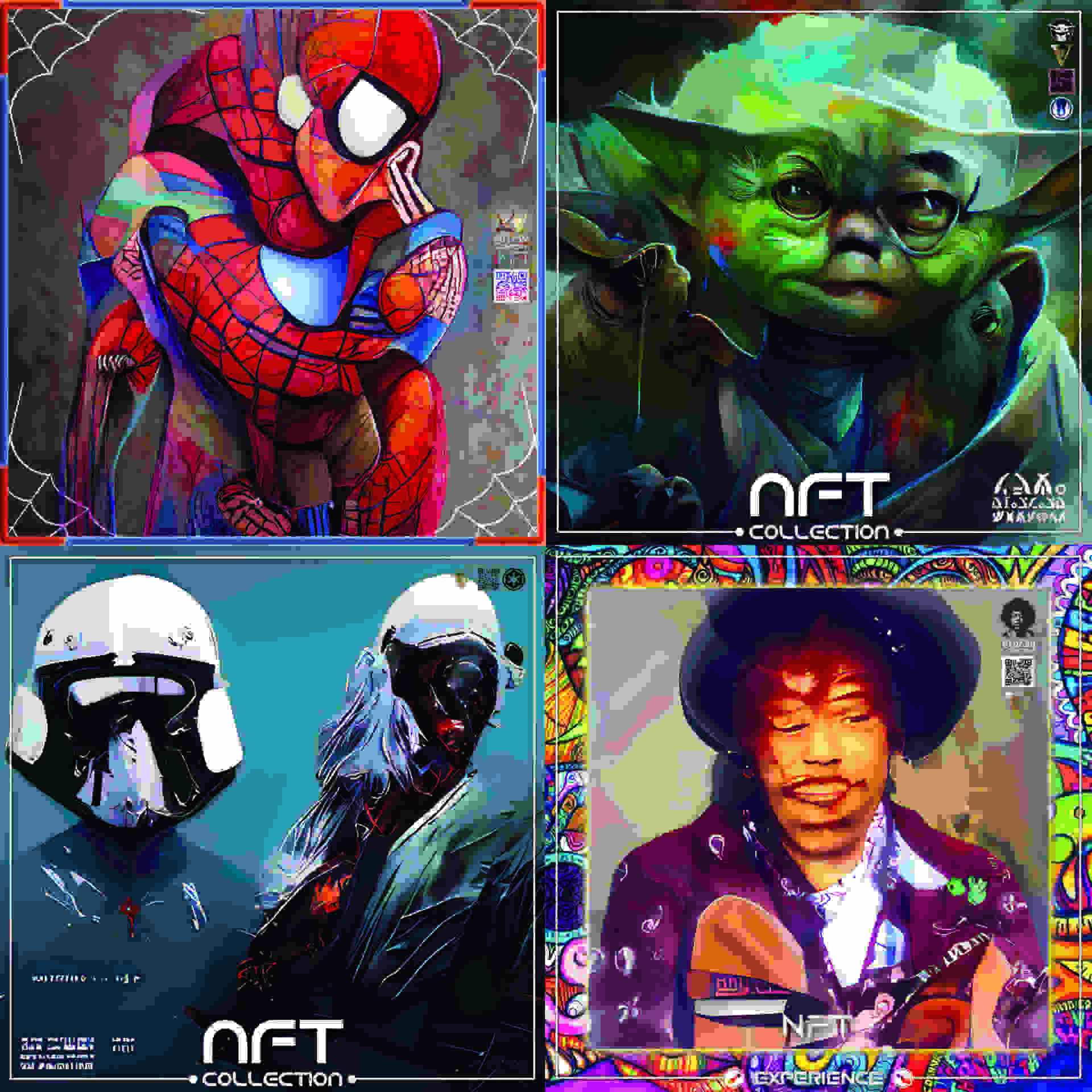Voici quelques exemples de mes collections de NFT que je vais bientôt minter sur la blockchain - Binance ou Solana sur les thèmes : Spiderman - Yoda - StarWars - Jimi Hendrix